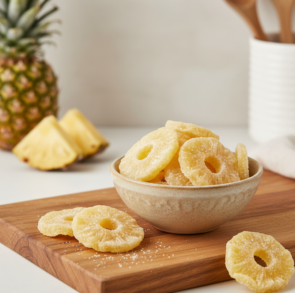 A szárított ananászkarikák élénk, friss és üdítően trópusi ízélményt nyújtanak. Napérlelt, érett ananászokból készülnek, amelyeket kíméletes szárítási folyamat során őrzünk meg természetes édességükkel, aromájukkal és aranyló színükkel együtt.